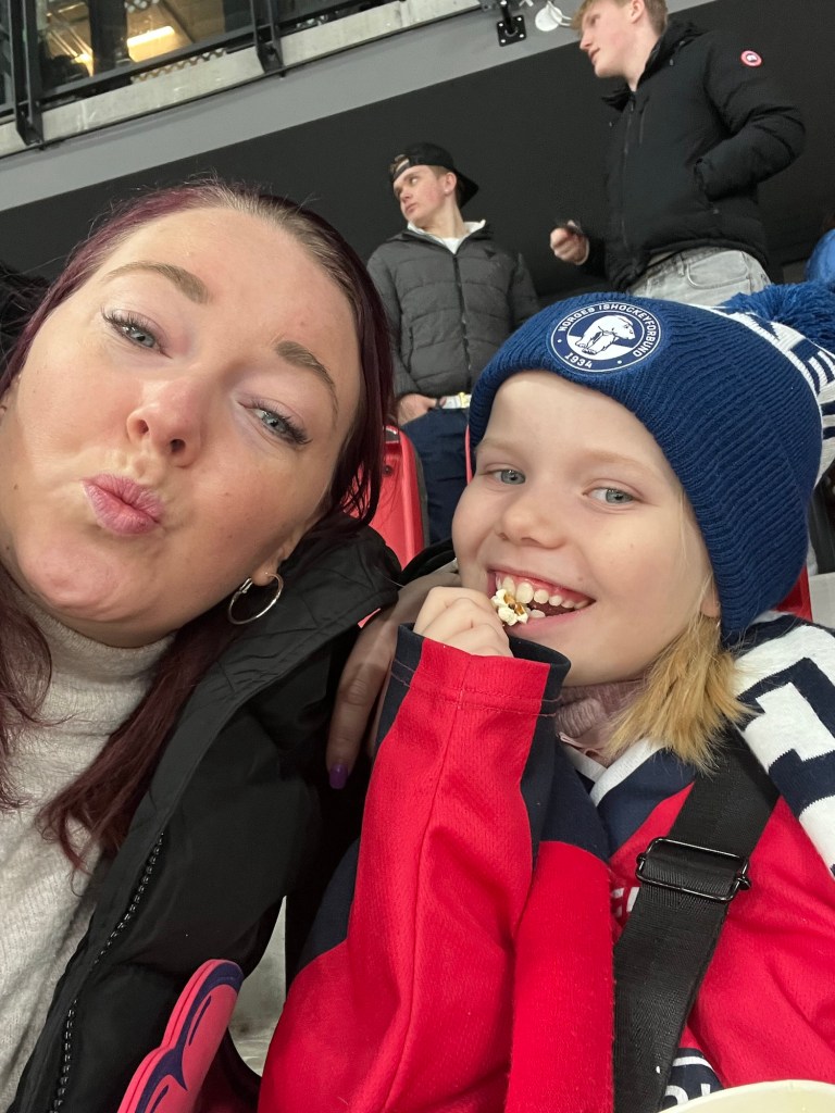 Vi checkade in på Radisson red Økern innan vi bokade taxi som tog oss till Jordal Amfi för Norges 🇳🇴 match mot Danmark 🇩🇰 och det blev VINST med 5-2 👏👏 vi stannade kvar efter matchen så vi fick hälsa och gratta pappa Tobias. ♥️
